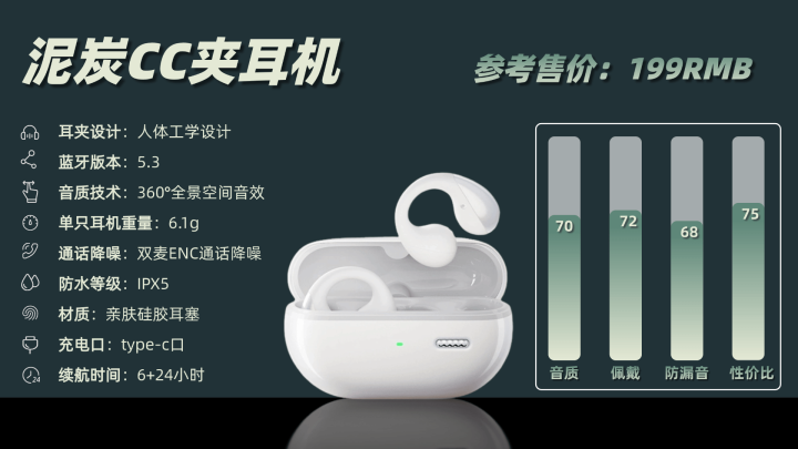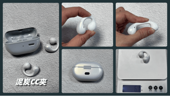 泥炭CC夹整体设计小巧精致,椭圆形外观配上珠光烤漆,质感细腻,充电盒正面有一排银色“小珍珠”控制按键,颇具设计感。耳夹固定单元带有防滑波点,加上记忆钢丝连接桥,使得佩戴稳固耐用。