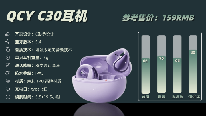 音质方面,耳机搭载17mm大动圈单元,低频厚实有力,鼓点表现出色,但高频解析略弱,整体三频均衡性稍欠。防水能力为IPX4,可抵御少量汗水和雨水。续航表现也不错,耳机单次可用约10小时,加上充电仓总续航可达20小时。C30i更适合追求个性外观且注重低频体验的用户。
