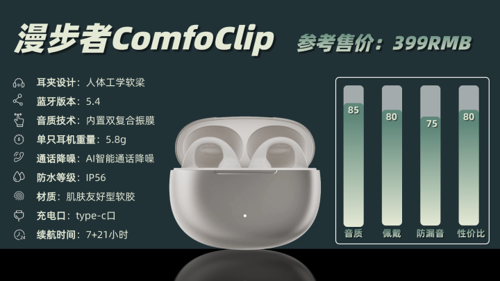 南卡ClipPro同样内置了Super Sound OS2.0发烧级开放式声学系统,能够很好的弥补开放式耳机三音的缺陷。此外耳机还搭载了新一代MCW多层复合宽环振膜,这种材料更适合开放式耳机发声原理,很好地增强了低频强度和下潜深度,显著提升了整体音质。ClipPro整体音质表现扎实,三音表现均衡,高音透亮,中频人声清晰,低音下潜足量感充沛,如果你预算在三百左右,注重音质,这款可以闭眼入!