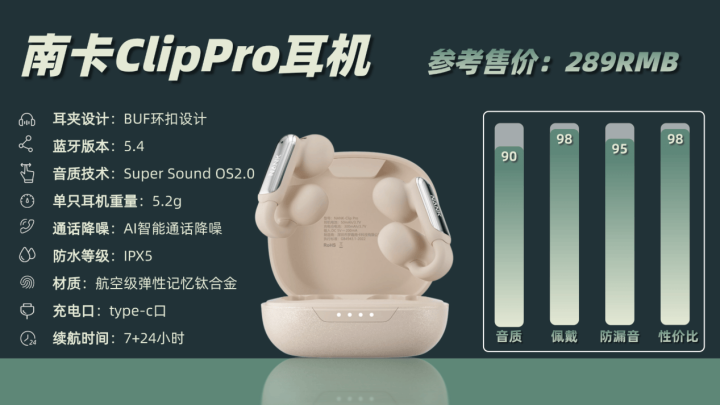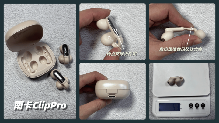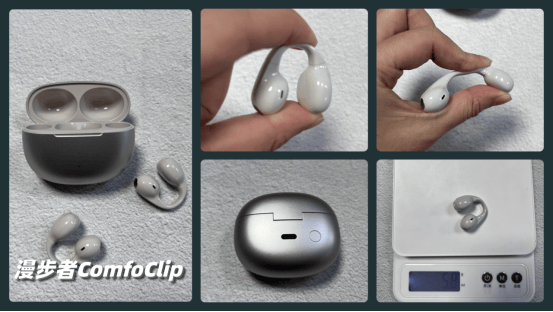 佩戴方面,南卡ClipPro没有采用传统的C形夹设计,而是创新采用自研的BUF环扣耳夹设计,与传统C形夹耳机相比多了一段长条板,能够更合的贴合耳廓,日常跑步、健身用实测狂甩不掉。且单只耳机重量仅5.1g,长条板在耳朵上还多个一个支撑点能够更好的分散耳机重量,亲测长时间佩戴也没有夹耳感。这款是真正实现了零压零感佩戴的耳夹式耳机!