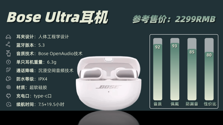 在声音方面,它搭载了Bose独有的OpenAudio开放式音频技术,低频氛围感浓厚,鼓点的冲击力和敲击的厚重感表现尤为出色,特别适合听节奏感强的音乐类型。不过在高频延展上略显不足,细节表现不算顶尖。防漏音能力中规中矩,当音量开到50%以上时,漏音会比较明显,因此更适合在户外或个人空间使用。续航方面,单次使用大约7.5小时,加上充电仓总续航可达20小时,日常运动和通勤完全够用。